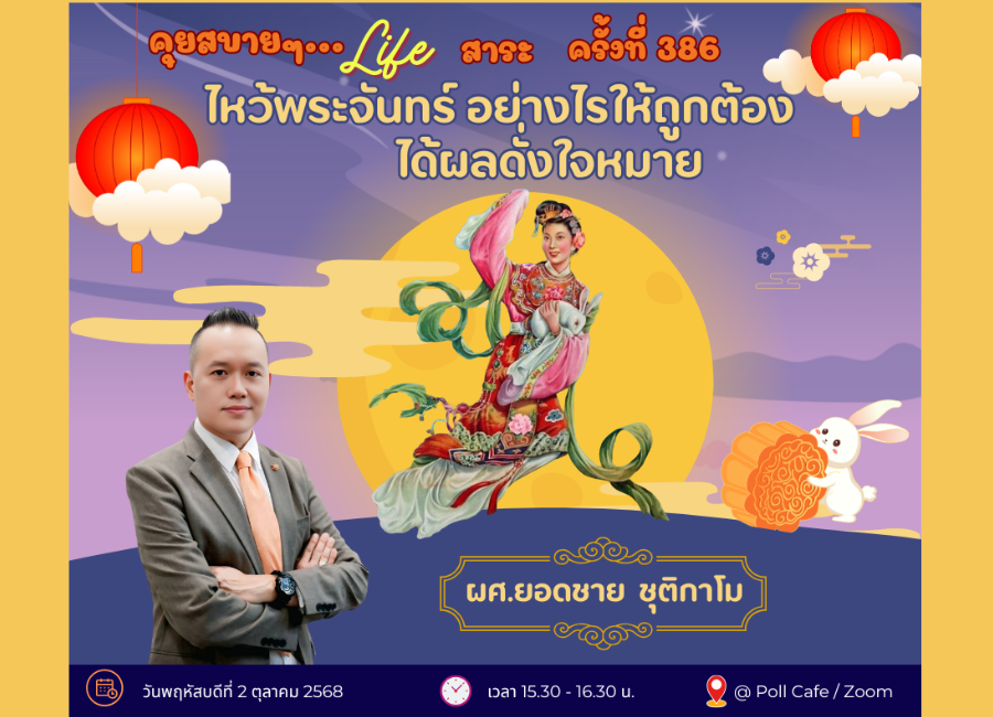 กิจกรรม “คุยสบาย ๆ…Life สาระ ครั้งที่ 386″ หัวข้อ : ไหว้พระจันทร์ อย่างไรให้ถูกต้อง ได้ผลดั่งใจหมาย พบกับ ผศ.ยอดชาย ชุติกาโม อาจารย์ประจำโรงเรียนกฎหมายและการเมือง