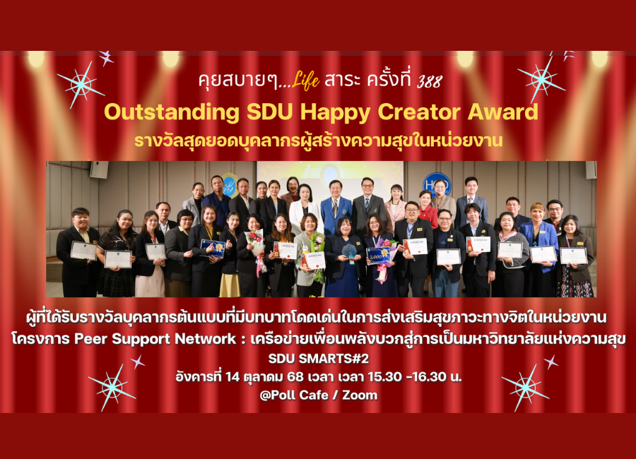 กิจกรรม “คุยสบาย ๆ…Life สาระ ครั้งที่ 388″ หัวข้อ : Outstanding SDU Happy Creator Award รางวัล สุดยอดบุคลากรผู้สร้างความสุขใน หน่วยงาน ผู้ที่ได้รับรางวัลบุคลากรต้นแบบที่มีบทบาทโดดเด่นในการส่งเสริมสุขภาวะทางจิตในหน่วยงาน โครงการ Peer Support Network : เครือข่ายเพื่อนพลังบวกสู่การเป็นมหาวิทยาลัยแห่งความสุข SDU SMARTS # 2