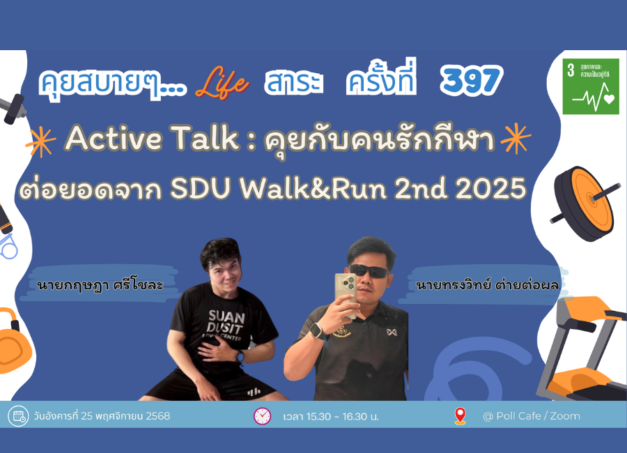 SDU Libary@Suphanburi 57 หมู่ 2 ต.โคกโคเฒ่า, เมือง, สุพรรณบุรี, Thailandขอเชิญเข้าร่วมกิจกรรม “คุยสบาย ๆ...Life สาระ ครั้งที่ 395" 📍 หัวข้อ :14 ผลงานเด่น : โครงการ การคัดเลือกผลงานดีเด่น 236 ผลงาน คนสวนดุสิต ในรอบ 1 ปี พบกับเจ้าของผลงานทั้ง 14 ผลงาน อาทิ 1.รศ.ดร.พรรณี สวนเพลง 2.คุณสินีนาฎ ลักษณะโยธิน 3.คุณศรีวรรณ พูลต่าย 4.คุณกิตติพงศ์ อิ่มประครองศิลป์ 5.คุณเหมพัสสิริร หว่างพัน 6.คุณจิรวัฒน์ สมิตสันต์ 7.ดร.มลิวัลย์ ธรรมแสง 8. อ.ดร.มุทิตา มากวิจิตร์ 9. อ.ดร.นิพัทธ์ชนก นาจพินิจ 10.อ.ธิติมา แก้วมณี 11.ผศ.ดร.ณัชนก นุกิจ 12.คุณสุขทิพย์ สุขใส 13.ดร.วาสนา จักร์แก้ว 14.อ.สรัฐ ฤทธิ์รณศักดิ์ 15.คุณอรทัย โกกิลกนิษฐ […]