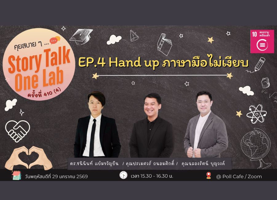 ขอเชิญเข้าร่วมกิจกรรม “คุยสบายๆ… Story Talk One Lab“ ครั้งที่ 410 (4) ประจำเดือนมกราคม Concept: “เปิดโลกความเท่าเทียมทางการศึกษา” กับคณะครุศาสตร์ มหาวิทยาลัยสวนดุสิต EP.4 “Hand Up ภาษามือไม่เงียบ”